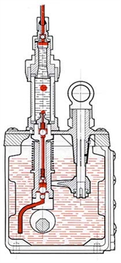Chaque cylindre de pompe, par l'action simultanée de l'arbre à cames, et du ressort antagoniste et par le jeu normal des clapets à billes, aspire l'huile dans le carter et la refoule vers le point à graisser. A la sortie de la pompe, l'huile monte au goutte à goutte, sous pression, par différence de densité, dans le verre du tube viseur rempli d'eau.